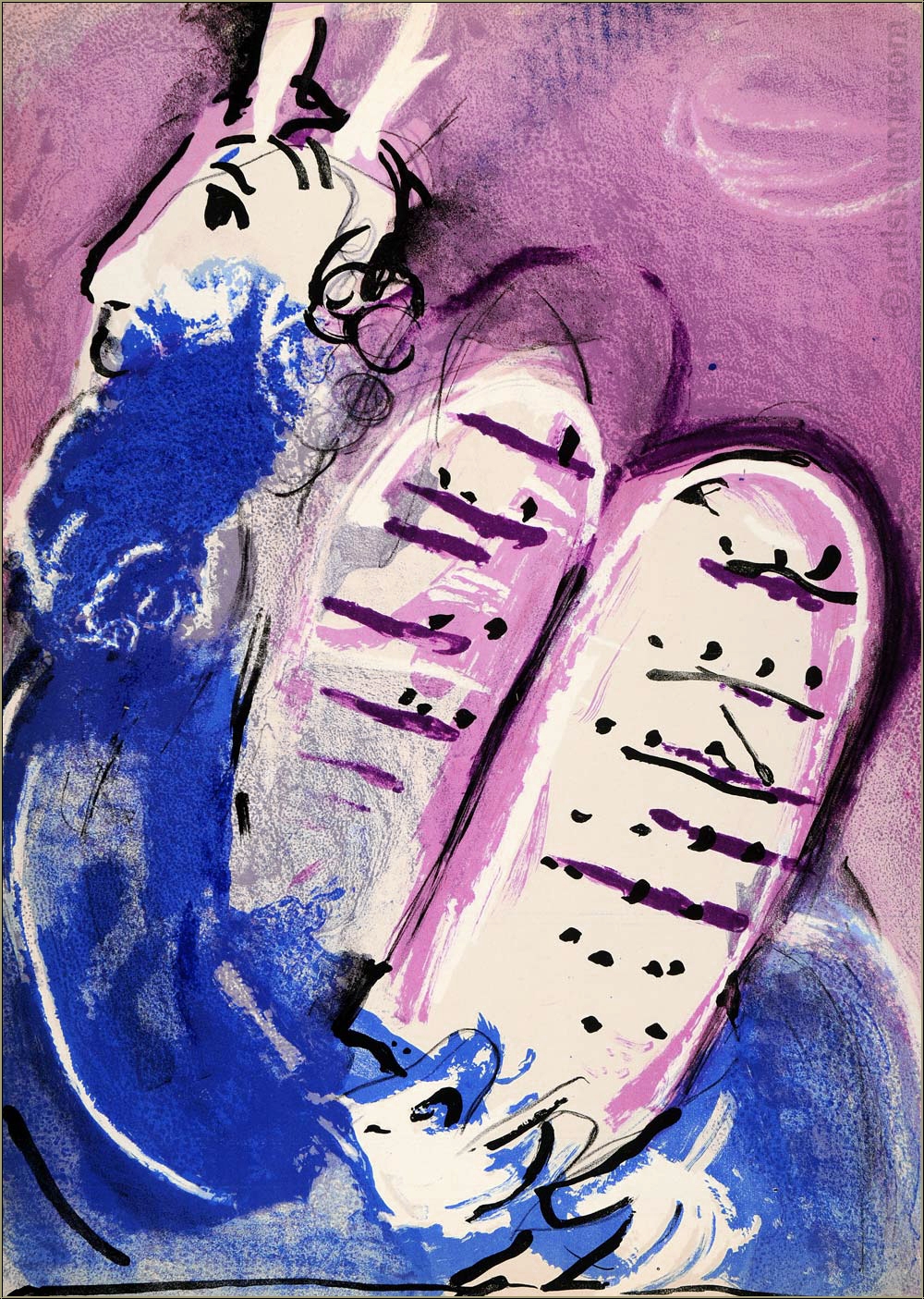 Dans ce troisième dessin de ceux dédiés à Moïse, Chagall montre que le visage de Moïse est tourné vers Dieu et qu'il a les yeux et les oreilles grand ouverts pour entendre ce que Dieu a à lui dire. Ses bras enlacent les tablettes de la loi avec les dix commandements comme s'il s'agissait d'un trésor précieux. Sa main droite désigne les commandements qui doivent permettent à chaque membre du peuple juif de vivre, à l'avenir, une vie digne, libre et juste. Le violet en arrière-plan suggère le côté spirituel de la situation, le bleu symbolise la foi de Dieu en son peuple, dans les bons comme dans les mauvais jours.