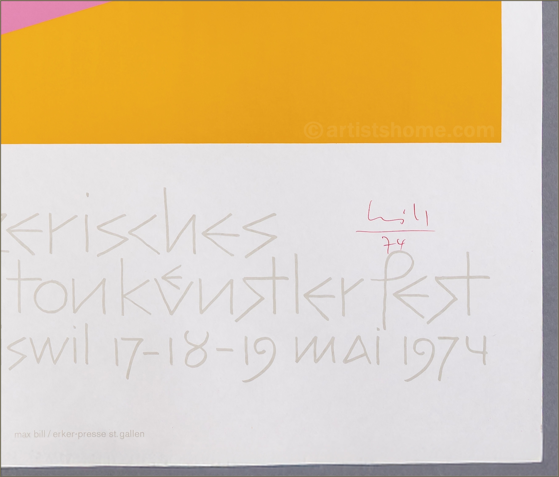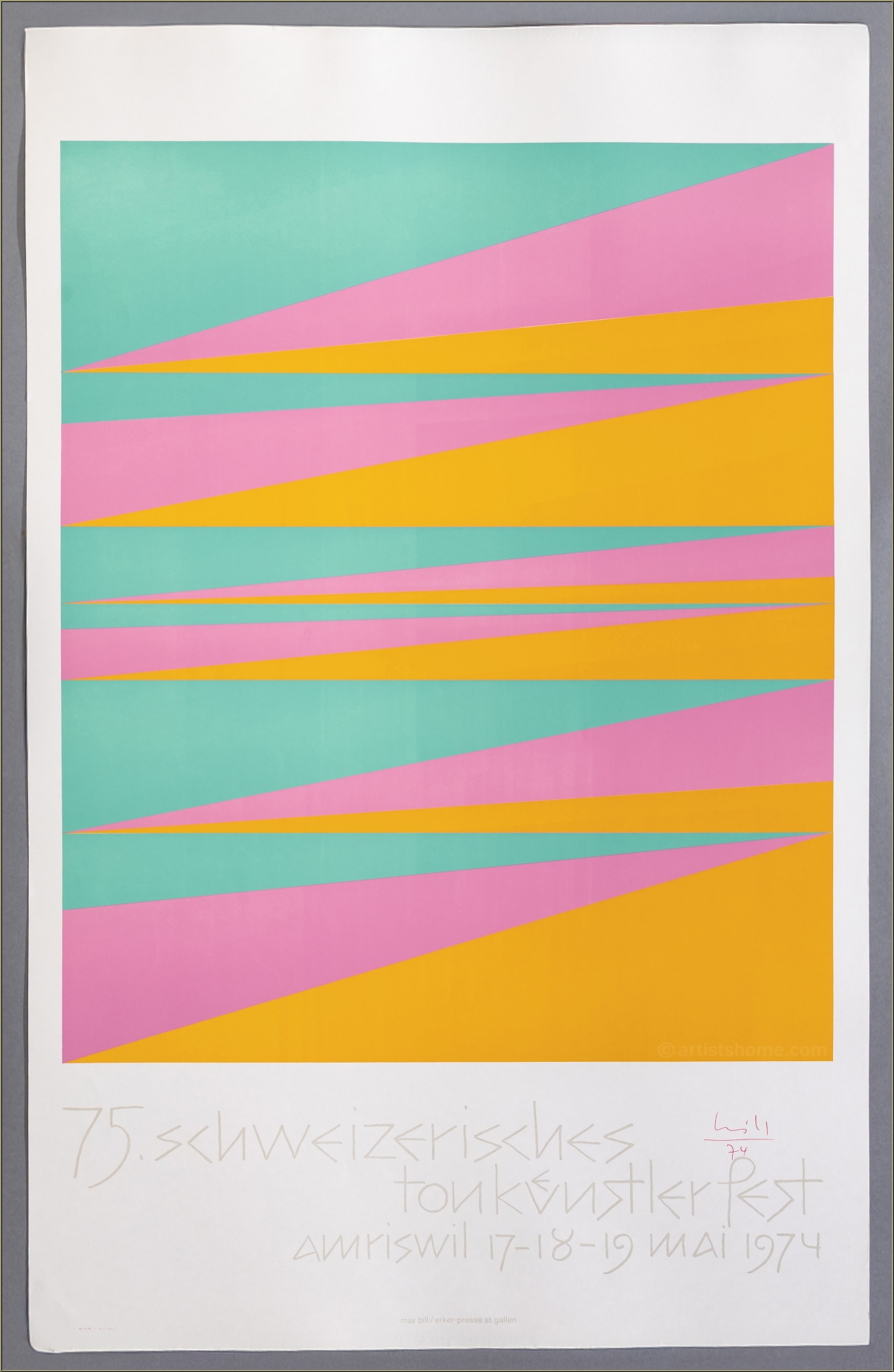 Détails :75. Schweizerisches Tonkünstlerfest Amriswil - Affiche originale, signée Lithographie tricolore aux tons pastel pour une affiche de l'Association suisse des musiciens à l'occasion de son 75e festival en 1974. Signée et datée par Max Bill au crayon rouge (voir photo 2).