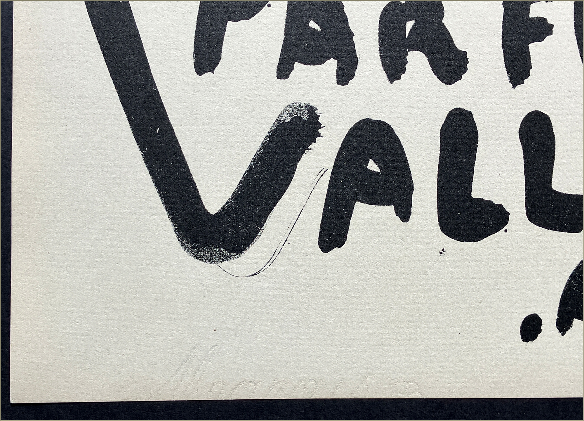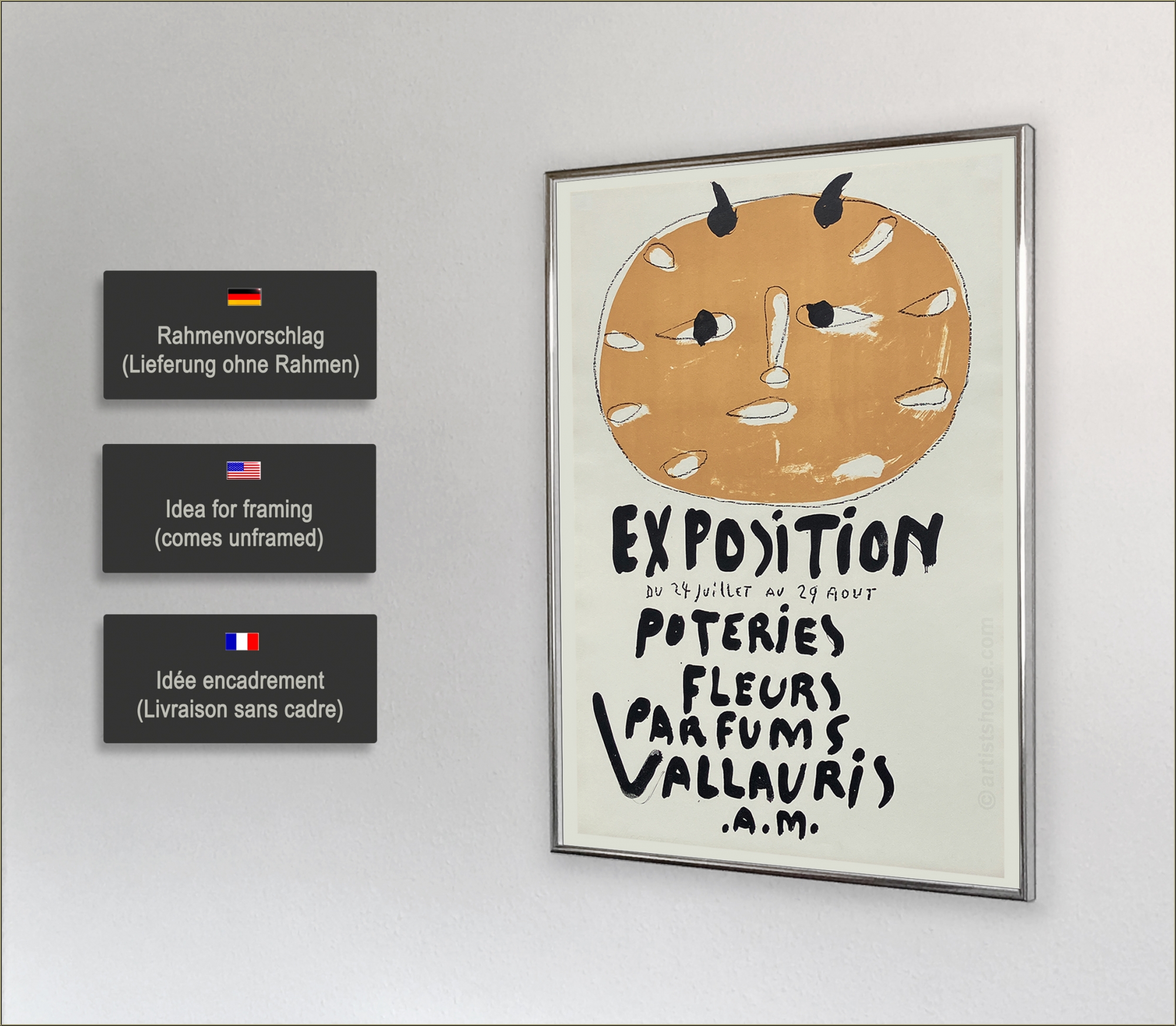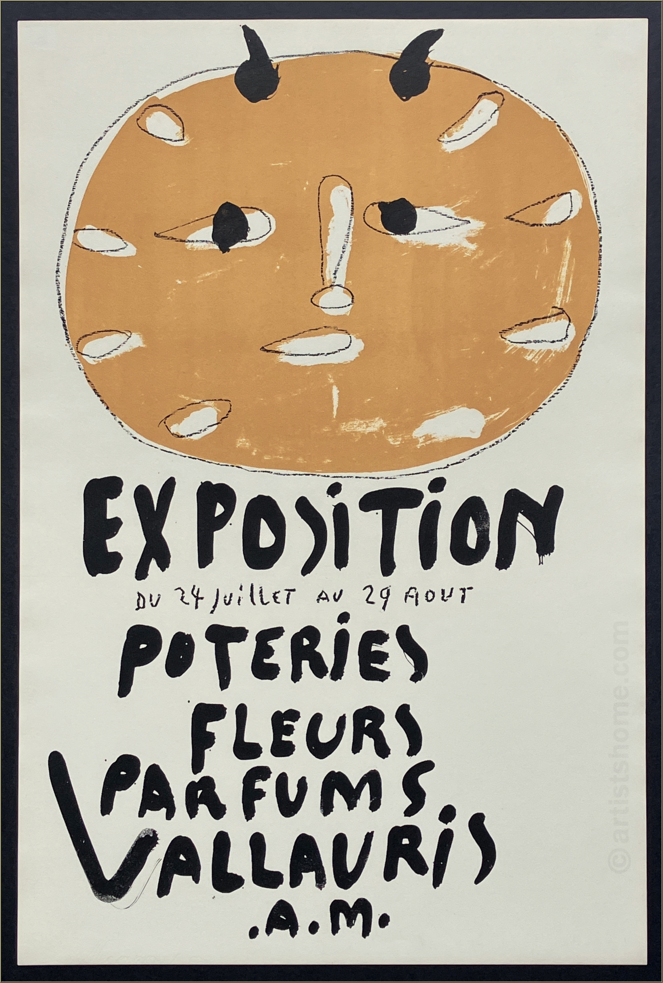 Détails :« Exposition Poteries Fleurs Parfums, Vallauris » Lithographie originale - première affiche Vallauris Selon les catalogues raisonnés (Czwiklitzer / Mourlot / Bloch / Rau) ceci la toute première affiche d'exposition de Picasso avec une lithographie originale (tête de faune souriant). Pièce rarissime.